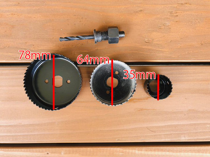 穴の直径は埋め込むものによって違ってくるので、mm単位でピッタリ合うホールソーを見つける必要があります。