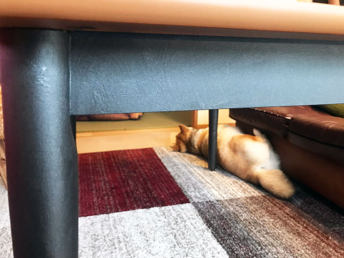 まずはリビングテーブルです。もともとは天板も足もウォールナットの木製リビングテーブルでしたが・・・