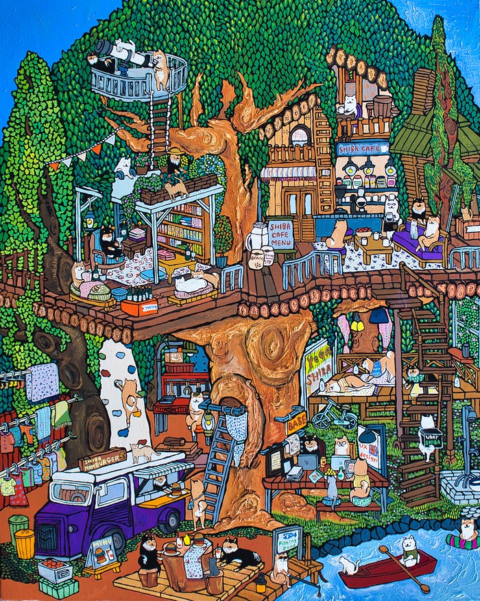 25匹の柴犬と8匹の猫が集まるツリーハウスの秘密基地「SHIBA BASE」を描きました。 よく晴れたある日、柴犬と猫達は湖の近くにあるツリーハウス「SHIBA BASE」に集まりそれぞれの時間の過ごします。